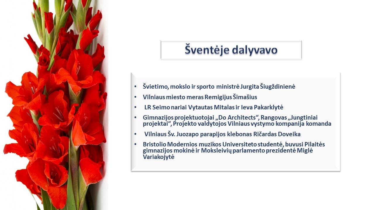 Meninės programos dalyviai: Lietuvos KASP bigbendas (vadovas Kapitonas Ričardas Čiupkovas, solistas Jurgis Brūzga), Gimnazijos ansamblis ,,Pilaitės muzika“ (vadovė mokytoja Kristina Žebrauskaitė - Šileikienė), Gimnazijos ,,Pilaitės teatras“ (vadovė mokyt. Jūratė Norkūnienė ir mokyt. Vita Nedzveckaitė)
