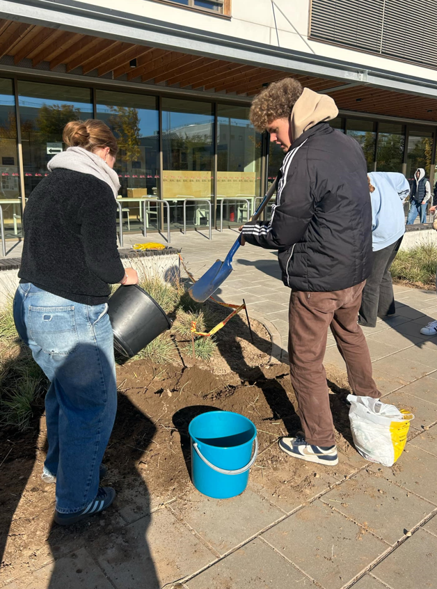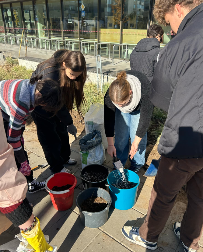 Šeštadienį, spalio 19 d., nuo 11 iki 15 valandos mokyklos savanoriai - mokiniai, mokytojai ir sekretorė su visa šeima, kasė žemę, stebino praeivius ir privertė autobusus pypsėti iš nuostabos. 10 entuziastingų, su šypsenomis veiduose ir darbo įrankiais rankose, sodino 4 rūšių tulpes ir po 4 valandų triūso susodino net 600 tulpių svogūnėlių!