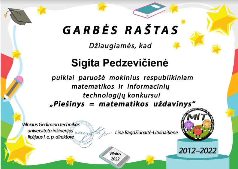 12 c kl. mokinė Ieva Trainavičiūtė (mokytoja Milda Tverkutė) tapo konkurso ,,Lietuva- tai aš, Lietuva-tai tu" antros vietos laimėtoja. Ją sveikina parodos organizatorius Seimo narys P. Saudargas