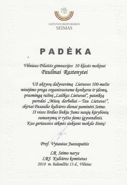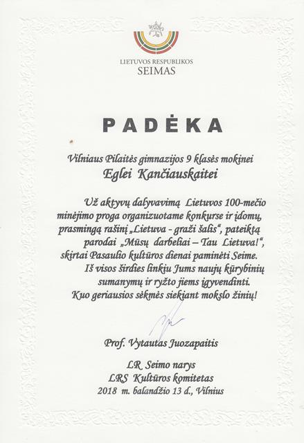 2017. Padėka IIh kl. mok. L. Bielinytei