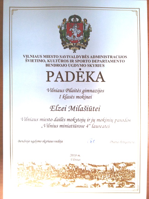 2016-11-29 Vilniaus miesto savivaldybėje vyko parodos ,,Vilnius miniatiūrose 3'' pristatymas. Joje dalyvavo ir mūsų gimnazijos mokiniai ir dailės mokytoja G. Slavinskienė. Darbai parodai buvo atrinkti gegužės mėn. Laureate tapo IIIb kl. mok. Augustina Račkovskytė, o IIIa kl. mok. Patricija Slavinskaitė, IVb kl. mok. Rokas Šimbrotas, IIh2 kl. mok. Šarūnas Švedas, IVa kl. mok. Ugnė Simutytė apdovanoti padėkos raštais.