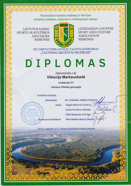 2018-11-26. Diplomas IVg klasės mokinei Viktorijai Markauskaitei