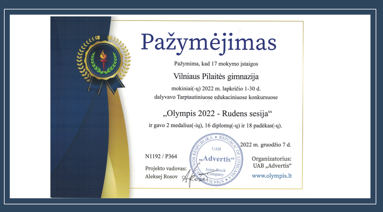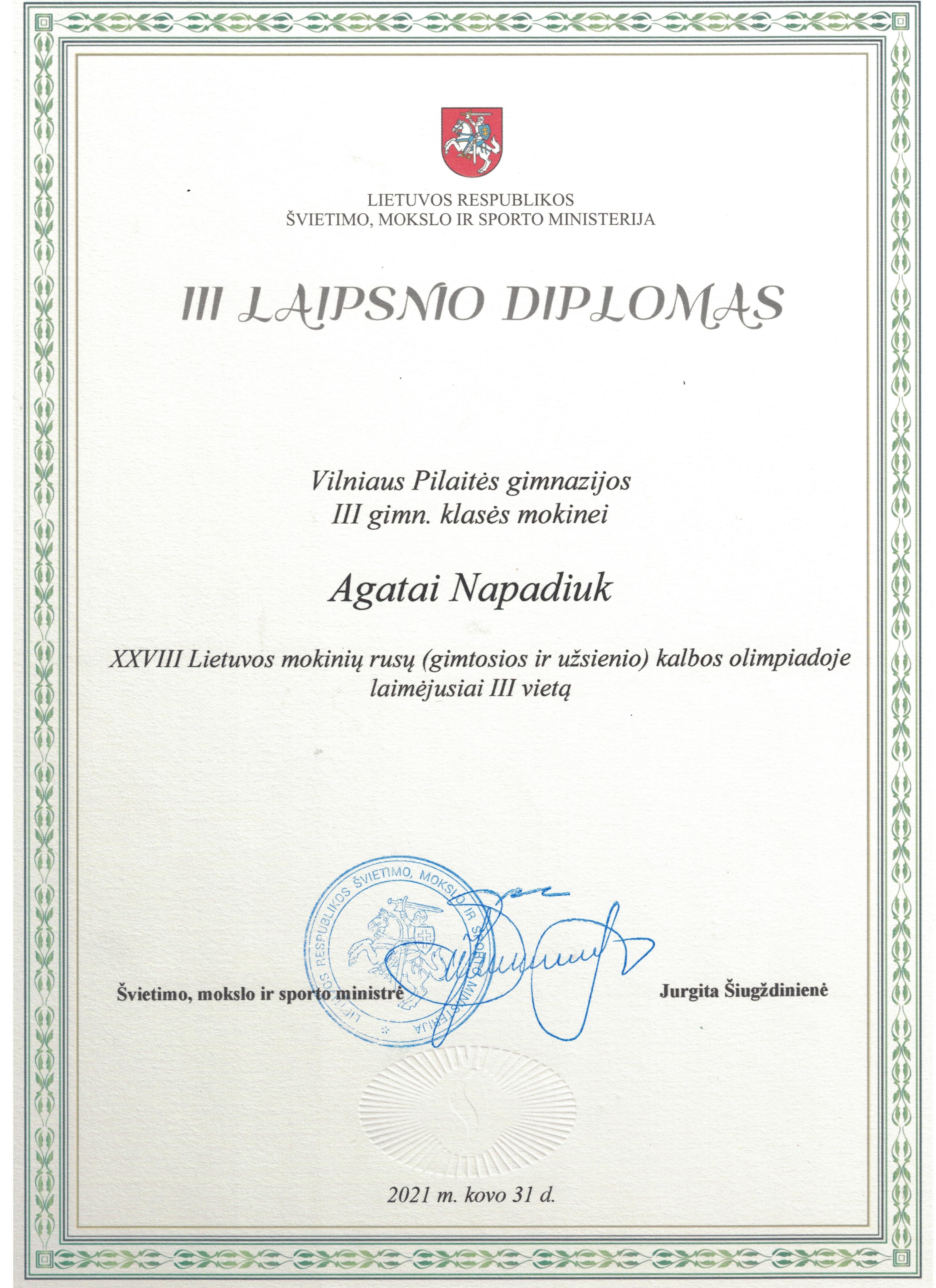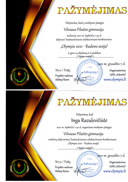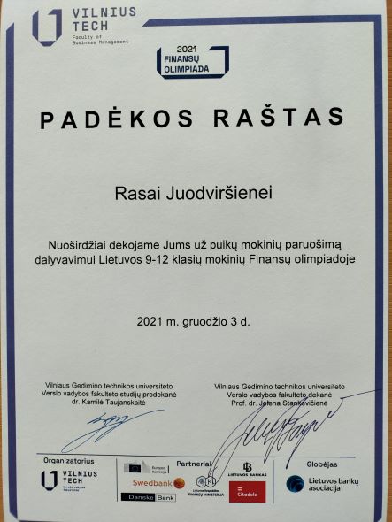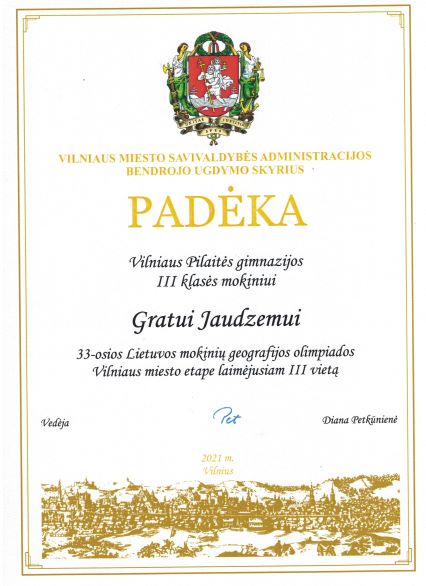 2021. Padėka III klasės mokiniui Gratui Jaudzemui