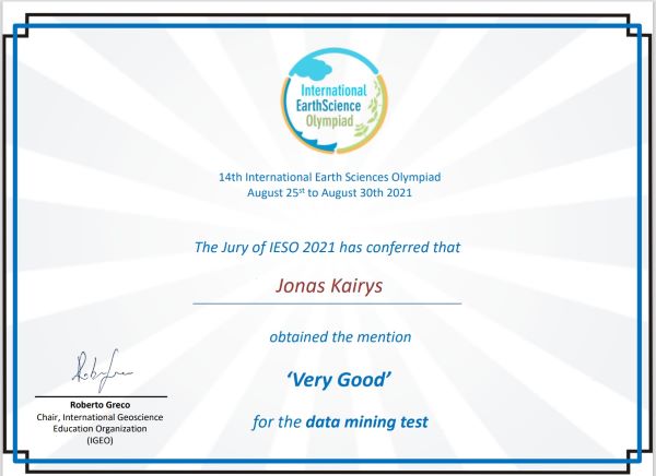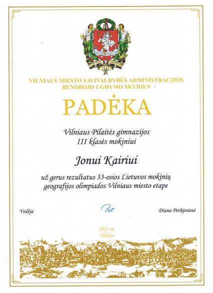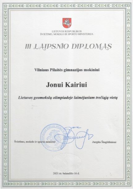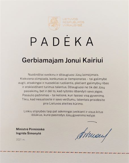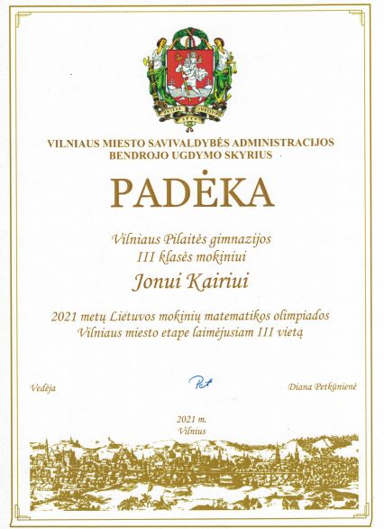 2021. Padėka III klasės mokiniui Jonui Kairiui (matematikos olimpiada)