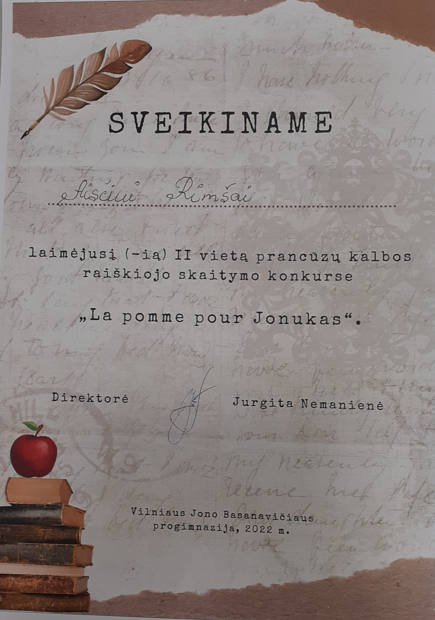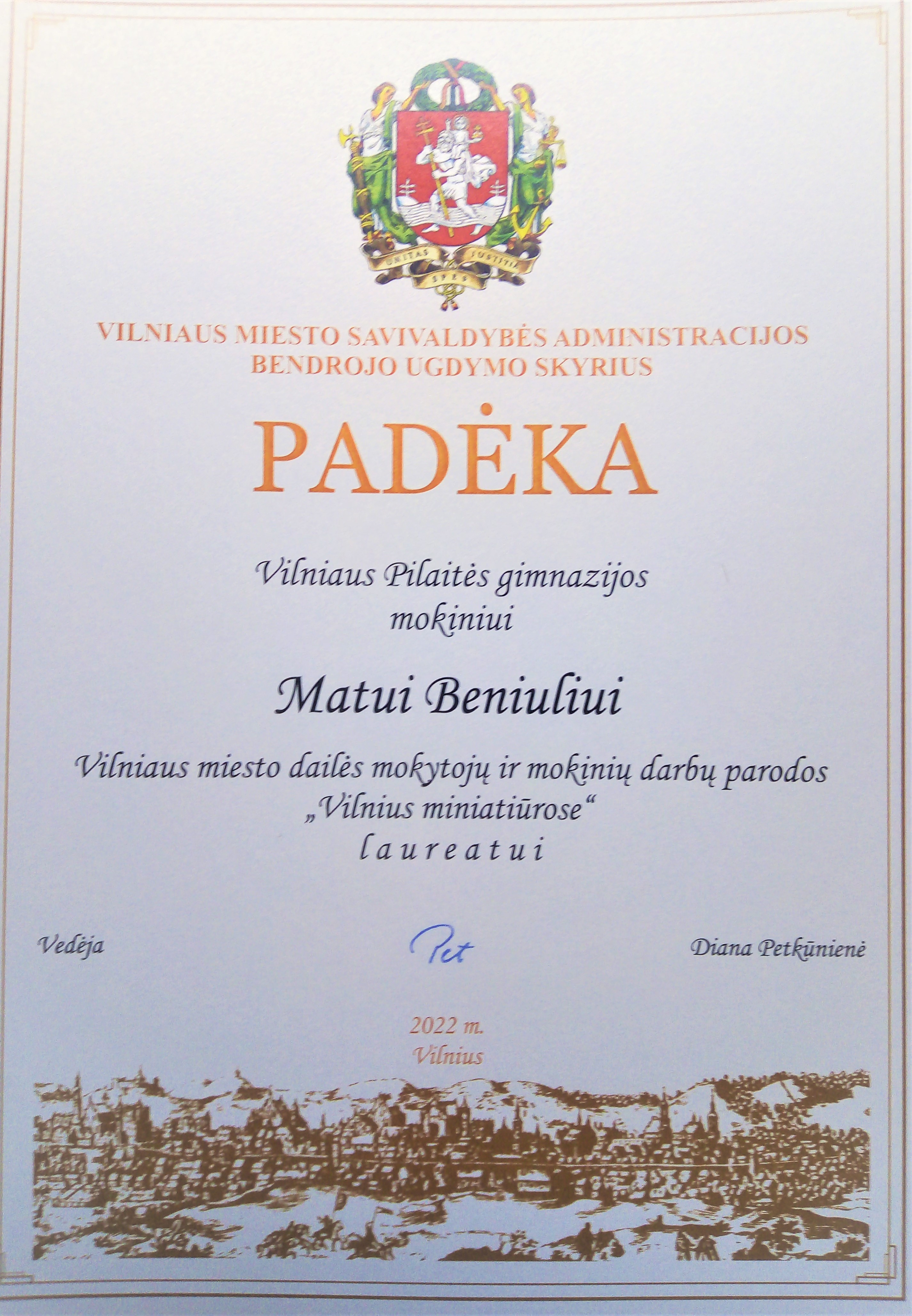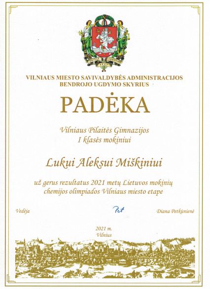 2021. Padėka I klasės mokiniui Lukui Aleksui Miškiniui