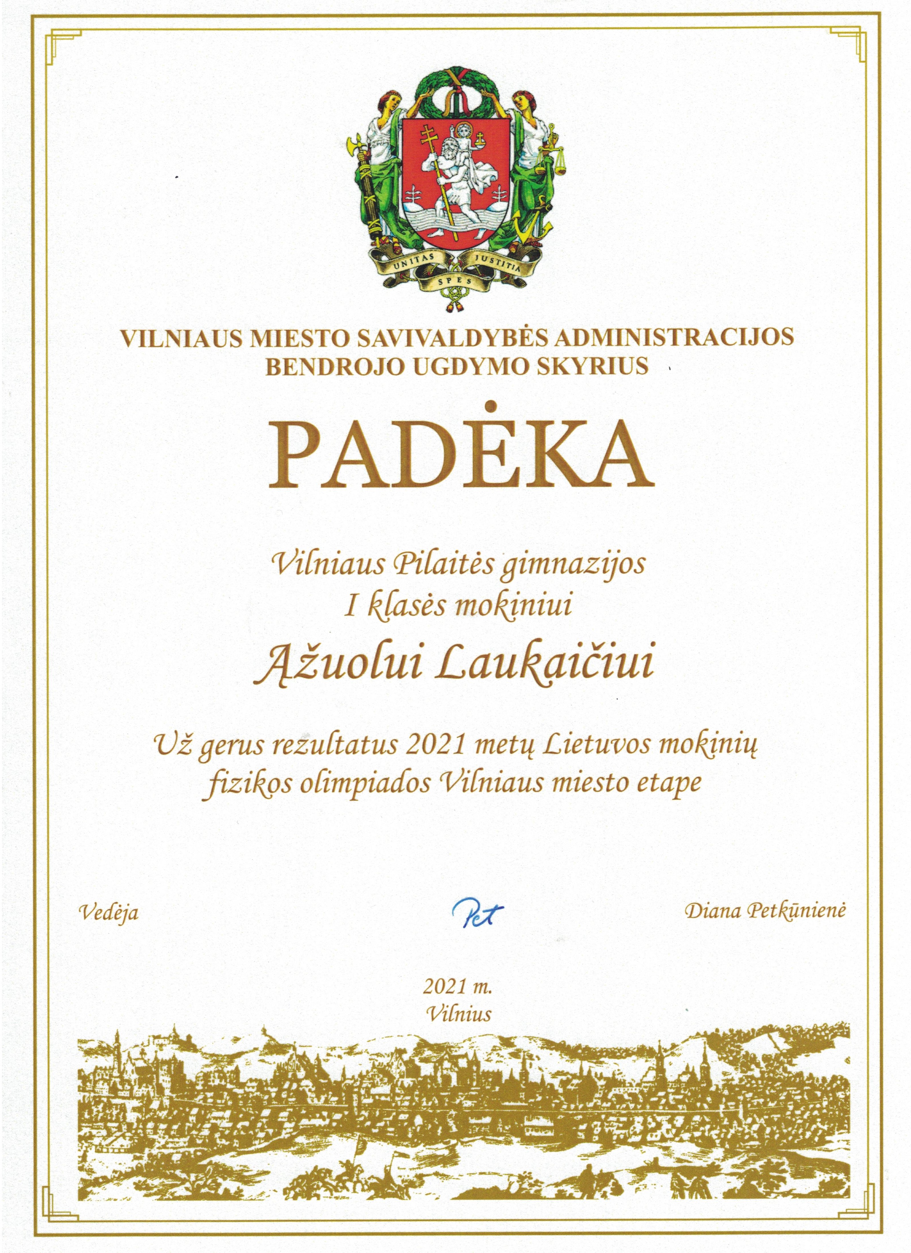 2021. Padėka I klasės mokiniui Ąžuolui Laukaičiui