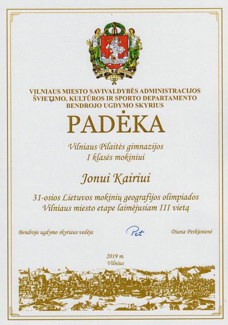 2019-05-22. Padėkos Vilniaus m. (9-12 kl.) geografijos olimpiados prizininkams