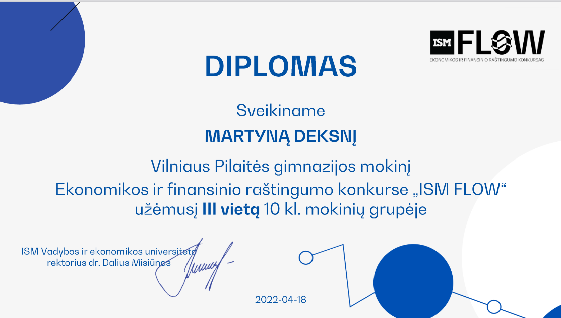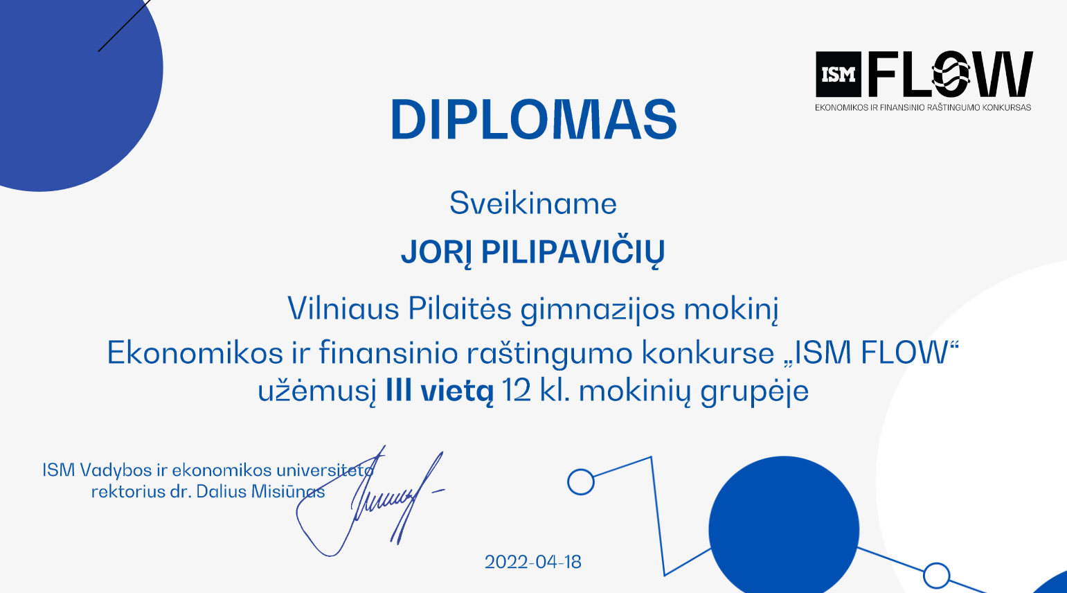 Sveikiname ekonomikos ir finansinio raštingumo konkurso „ISM FLOW“ nugalėtojus: ketvirtoką Jorį Pilipavičių užėmus III vietą ir Martyną Deksnį užėmus III vietą!