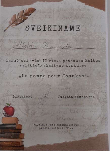 Gegužės 20 d. II b klasės mokiniai Nikolė Pacevičiūtė ir Aistis Rimša dalyvavo Vilniaus miesto prancūzų kabos poezijos skaitovų konkurse ,,La pomme pour Jonukas". Aistis deklamavo Paul'o Verlaine'o eilėraštį ,,l pleure dans mon coeur ...". Abu mokiniai laimėjo II vietą. Nuoširdžiai sveikiname! Renginys vyko J.Basanavičiaus progimnazijoje.