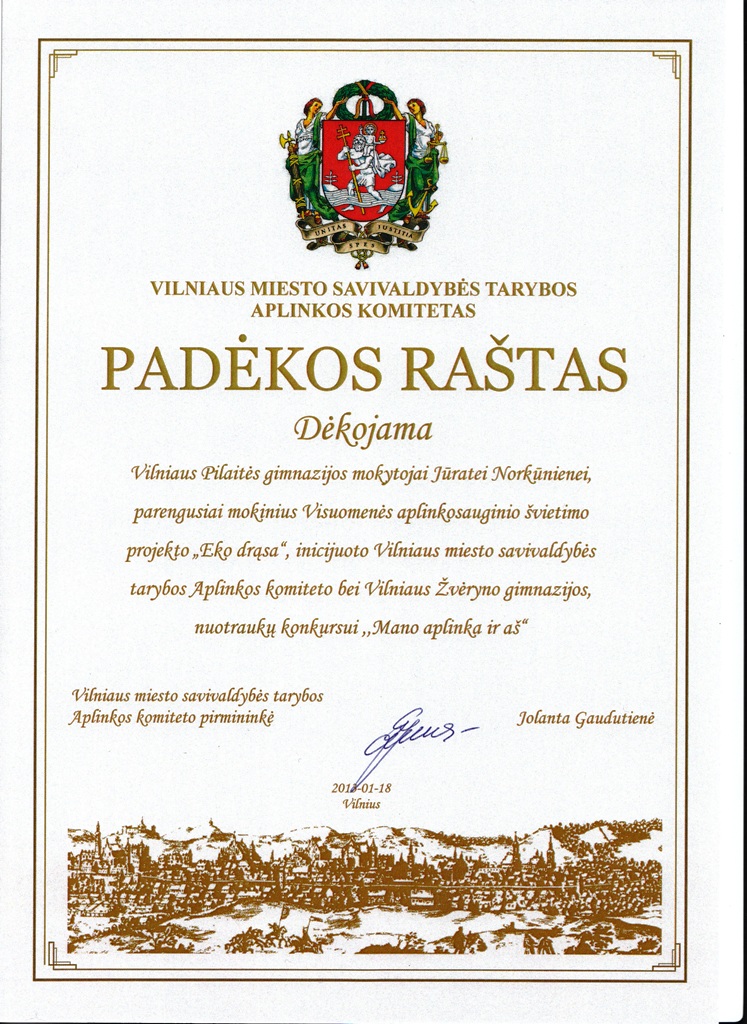 2014. Padėka mokytojoms J. Šveckutei, M. Minderienei ir A. Baliukynaitei