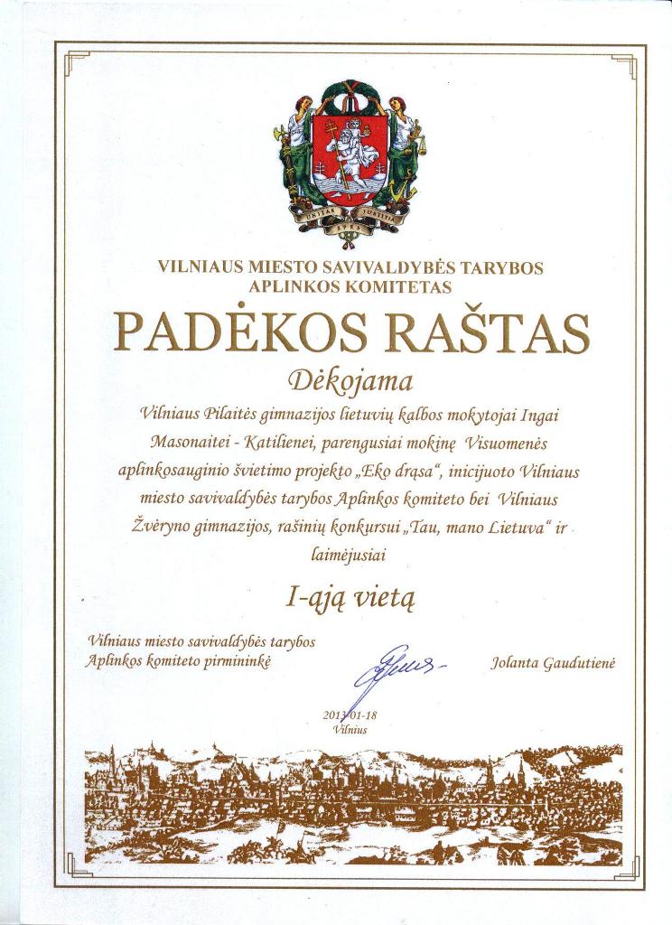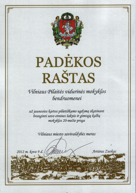 2012. Padėka Vilniaus purpuriniam jaunuolių chorui