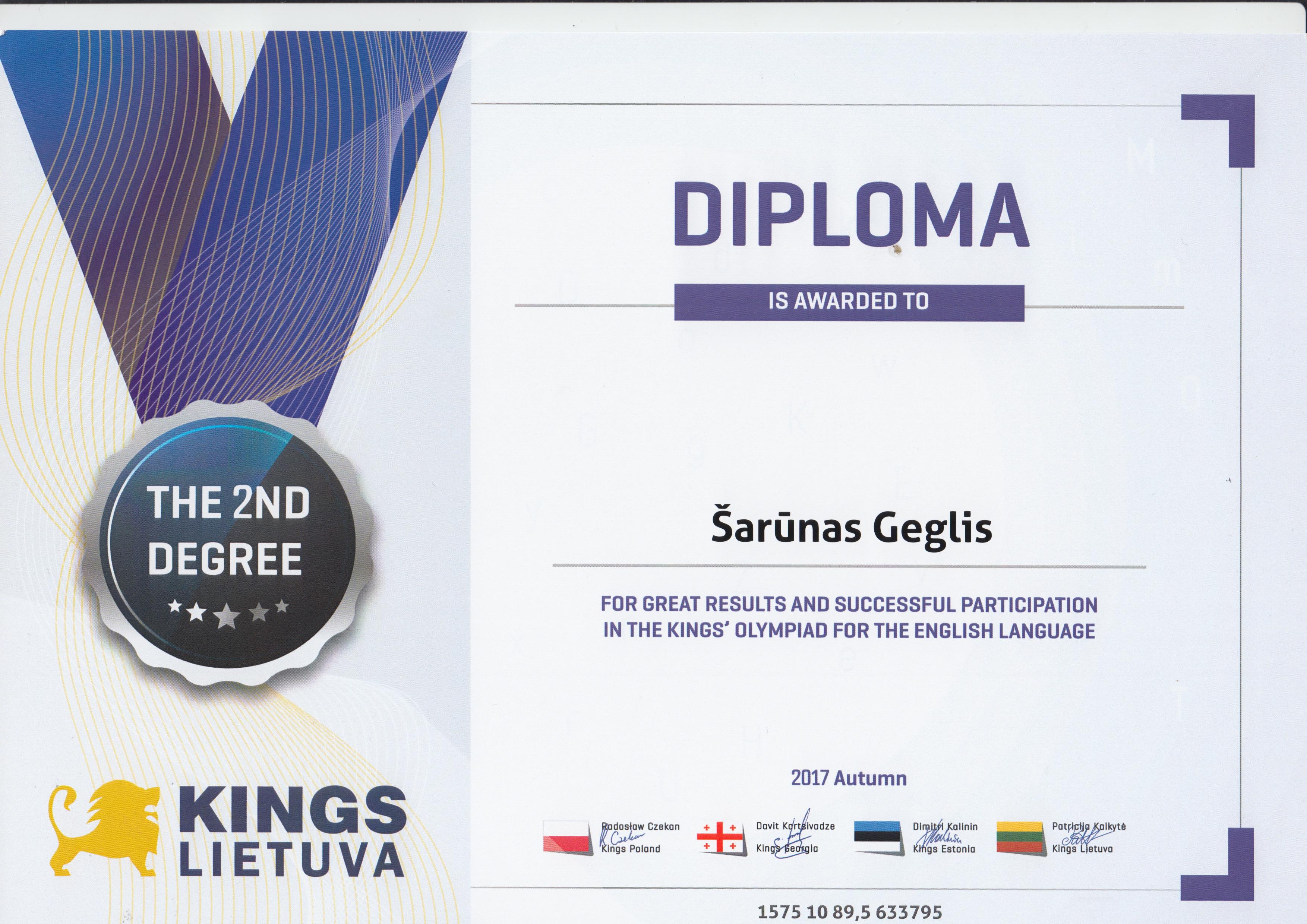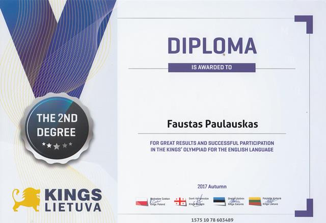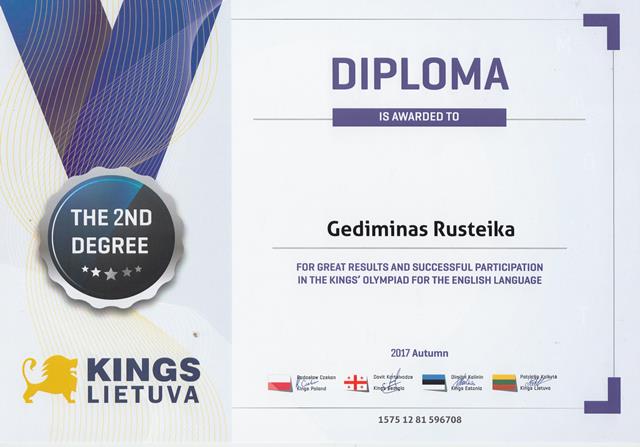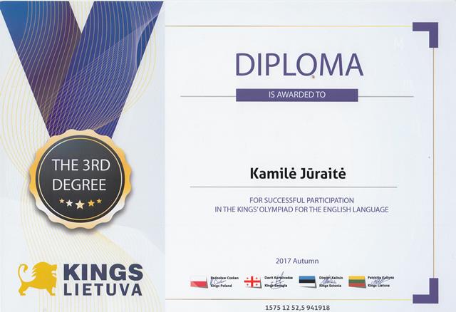 2018-02-08. Tarptautinės KINGS olimpiados organizatorių padėka anglų kalbos mokytojai O. Andrukonienei ir jos mokiniams