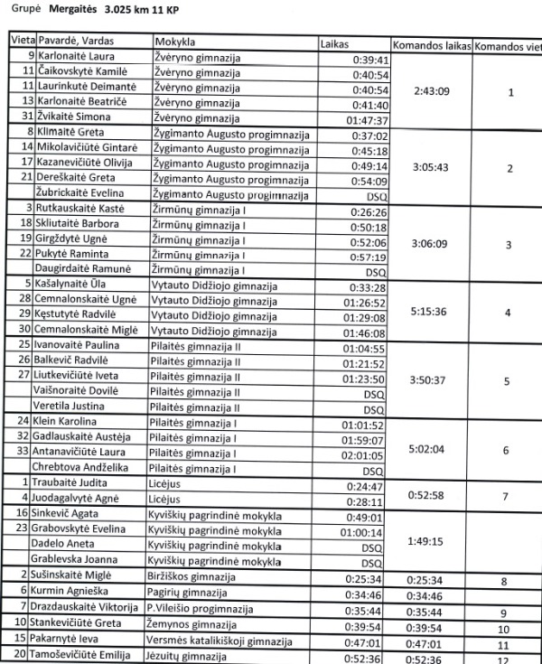 Varžybose rungtyniavo 12 merginų komandų. Geriau sekėsi antrai merginų komandai, jos užėmė V vietą ( P. Ivanovaitė, R. Balkevič, I. Liubkevičiūtė, D.Vaišnoraitė, J. Veretila). O pirma komanda užėmė VI vietą (K. Klein, A. Gadlauskaitė, L.Antanavičiūtė, A. Chrebtova). Tarp Pilaitės gimnazijos merginų geriausiai pasirodė Karolina Klein IH2, jos rezultatas bendroje įskaitoje 24 iš 40 dalyvių. Komandos trenerė Daiva Kapčinskienė.